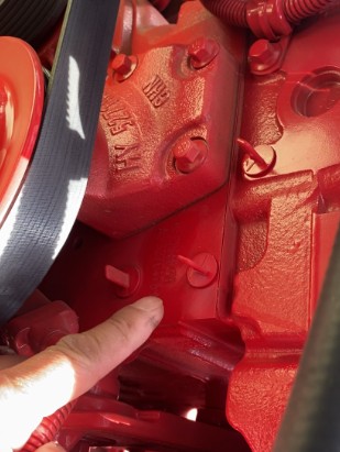 2、東風(fēng)多利卡D9灑水車,配康明斯230馬力發(fā)動(dòng)機(jī),發(fā)動(dòng)機(jī)缸體號(hào),在發(fā)動(dòng)機(jī)的前方,主駕駛座椅下面的位置,找到皮帶輪,靠近身體一側(cè)的皮帶輪旁邊有兩個(gè)塑料,像以前老式電視機(jī)調(diào)頻道的開(kāi)關(guān)一樣的配件,這兩個(gè)配件,上下在一條直線上,這兩個(gè)配件中間就是缸體號(hào)。