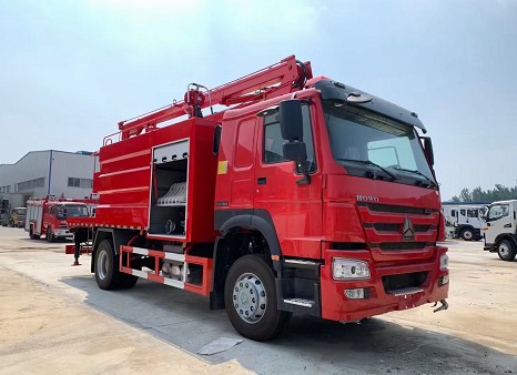 出口型重汽豪沃消防、灑水、高空作業(yè)三種功能于一體的多功能消防車_湖北江南消防車廠家