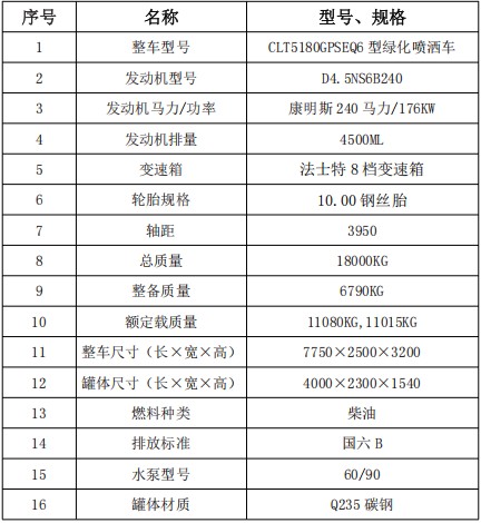 1、整車(chē)型號(hào): CLT5180GPSEQ6型綠化噴灑車(chē)